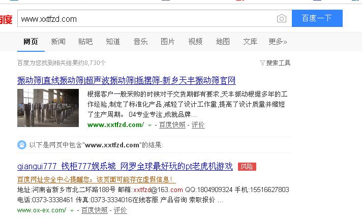 第二條信息,下面的地址,郵箱啊等等資料都是我們新鄉市天豐振動機械公司的,但是打開內容,卻是一個很不的網站,我查看了一下源代碼,沒有我們公司的,這是什么情況呢,然后我又看百度快照信息,結果如下: